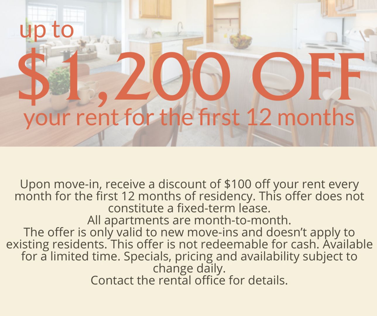 Upon move-in, receive a discount of $100 off your rent every month for the first 12 months of residency. This offer does not constitute a fixed-term lease. All apartments are month-to-month. Resident and/or owner/agent reserve the right to terminate the tenancy at any time according to state law and terms of the agreement. The offer is only valid to new move-ins and doesn’t apply to existing residents. This offer is not redeemable for cash. Available for a limited time. Specials, pricing and availability subject to change daily. Contact the rental office for details.