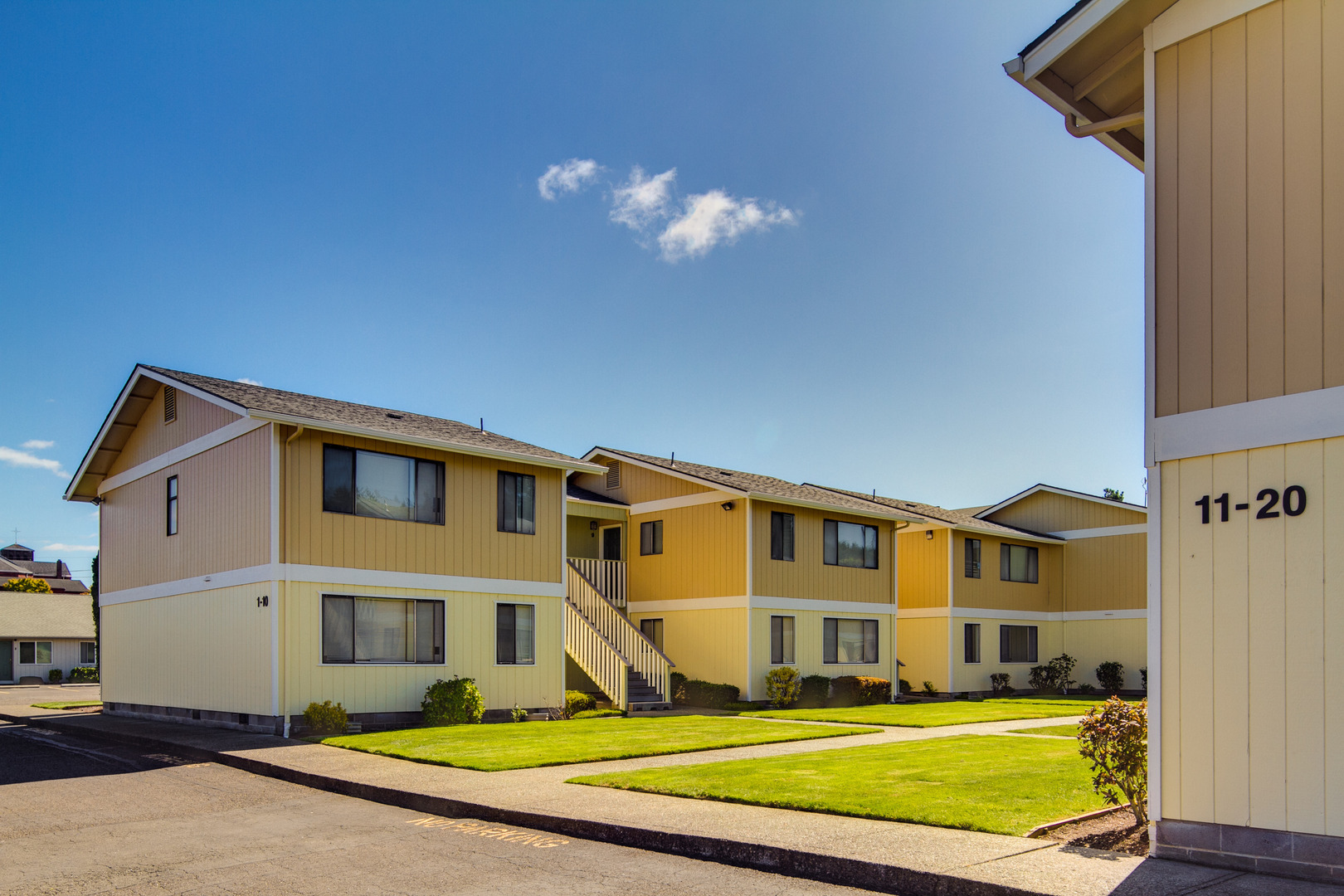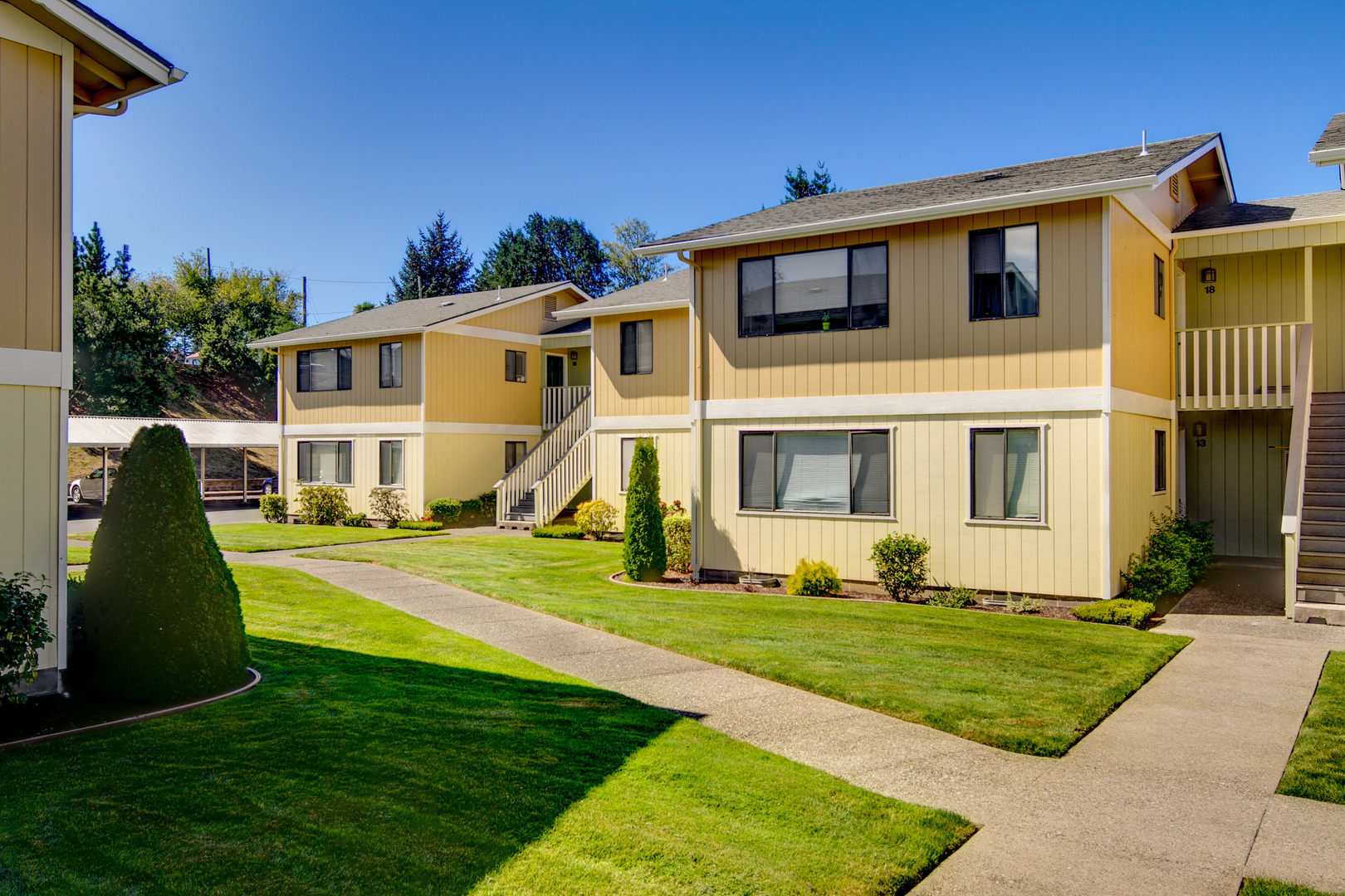 Clean and well-maintained 2 bedroom/1 bathroom apartment tucked in quiet corner of a dead-end street. Water, sewer and garbage PAID. Galley kitchen includes refrigerator, dishwasher, and range. Clean and safe on-site laundry facility. One dedicated covered parking space as well as off street uncovered parking for second car or guest. Conveniently located near downtown Coos Bay. Community garden, public library, schools, shopping and restaurants just steps away. Sorry no dogs or cats as pets.